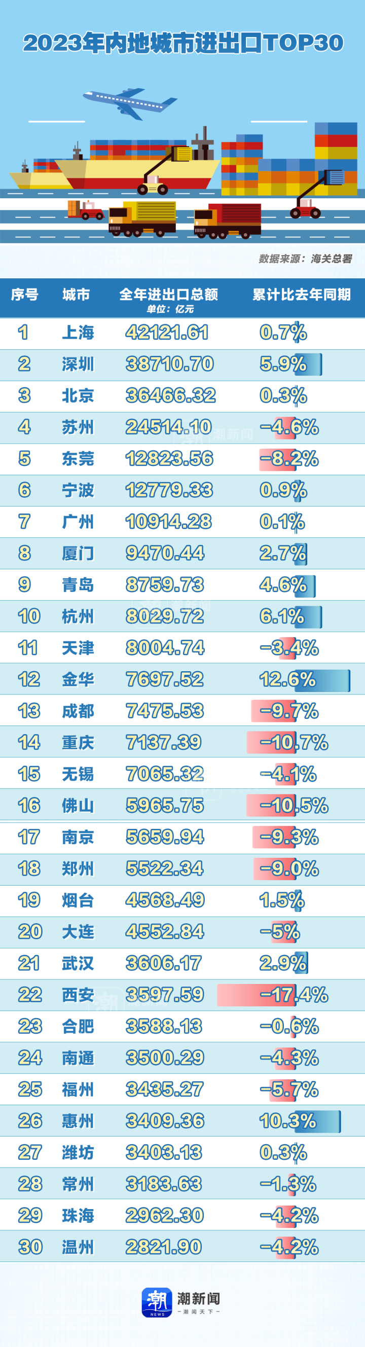 十强之中,苏州和东莞是唯二出现下滑的城市,其中苏州2023年进出口总额2.45万亿元,增速下滑4.6%;东莞进出口总额1.28万亿元,增速下滑8.2%。