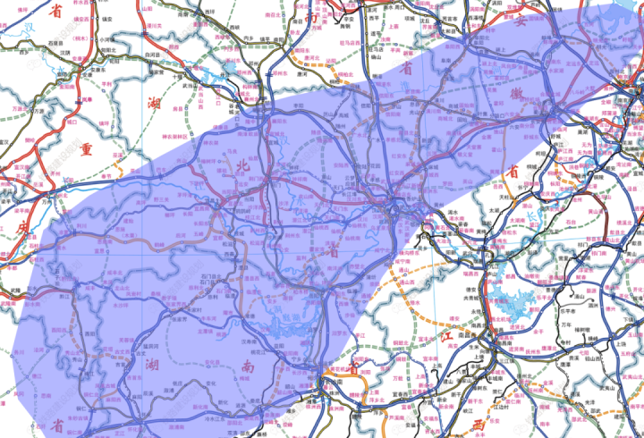 △综合当前气象部门预报结果,划定的可能受降雪、冻雨严重影响的区域(蓝色区域)和铁路交通情况。(注:此图包括部分规划的铁路线路)