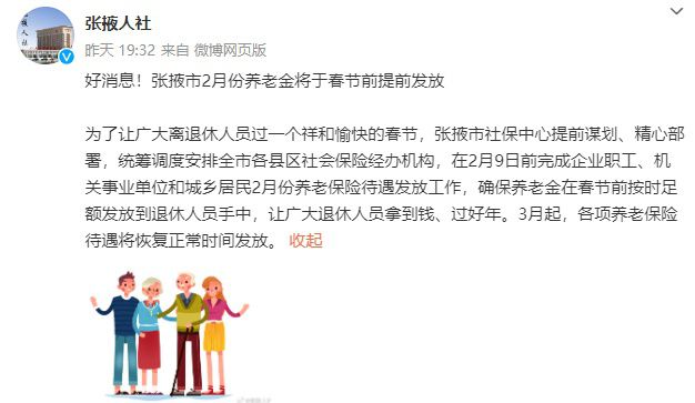 2月1日,张掖市人社局发文称,将在2月9日前完成企业职工、机关事业单位和城乡居民2月份养老保险待遇发放工作。