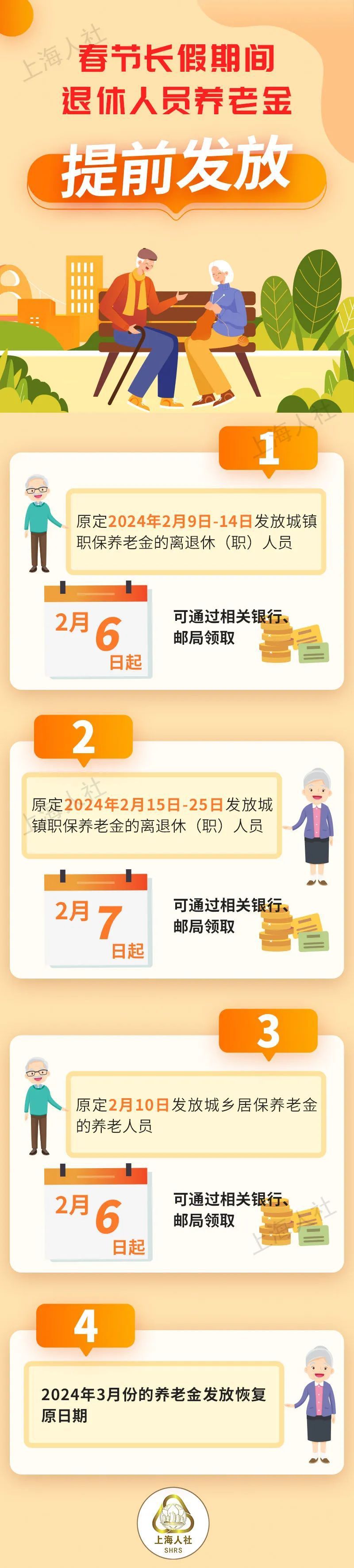 1月31日,上海市人社局发文称,将对春节长假期间发放的离退休(职)人员养老金提前发放,具体安排如下: