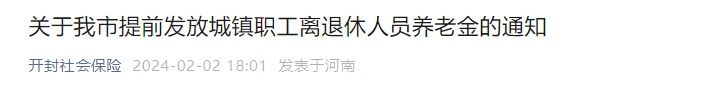 2月2日,开封市社会保险中心发文称,将对2月份的离退休人员养老金进行提前发放,原定每月15日发放城镇职工养老金的离退休(职)人员养老金,预计于2月9日发放到位。