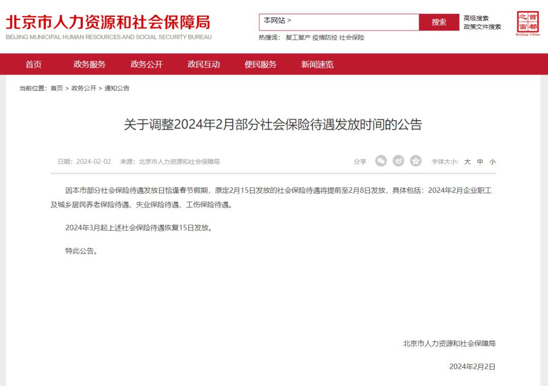 2月2日,北京市人社局发布公告,因该市部分社会保险待遇发放日恰逢春节假期,原定2月15日发放的社会保险待遇将提前至2月8日发放,具体包括:2024年2月企业职工及城乡居民养老保险待遇、失业保险待遇、工伤保险待遇。