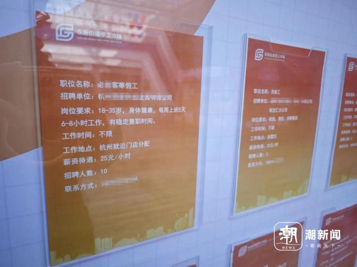 因为天气原因,东新街道零工市场的咨询亭处于暂停状态,边上的招工栏里贴满了招工信息,寒假工、洗碗工、兼职分拣员……其中大部分都来自于餐饮和物流行业。