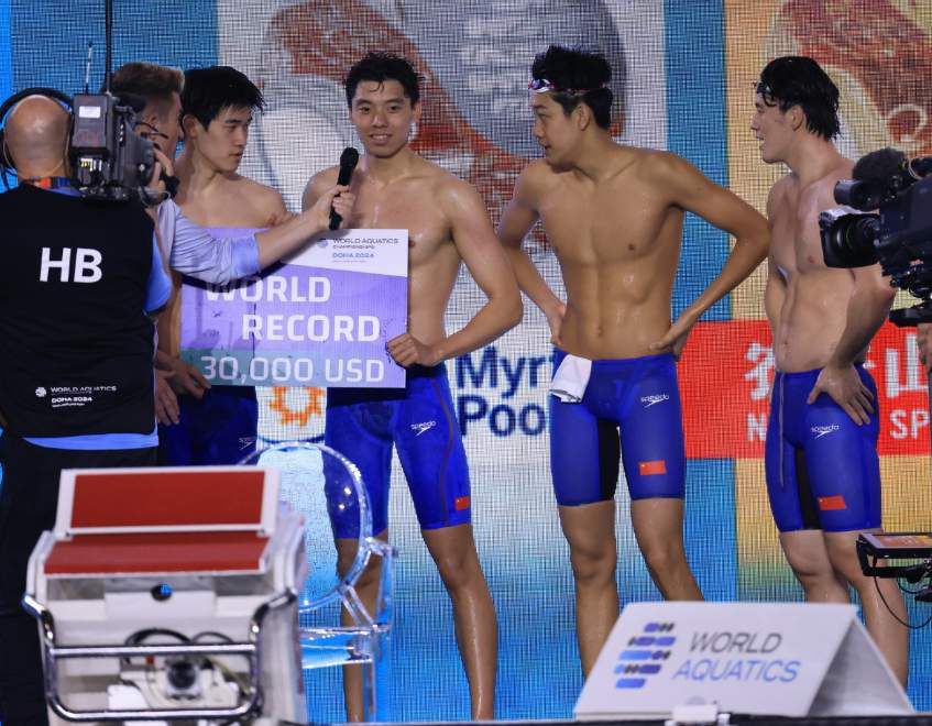 中国队潘展乐/季新杰/张展硕/王浩宇赢得2024世界泳联世锦赛男子4x100米自由泳接力冠军!