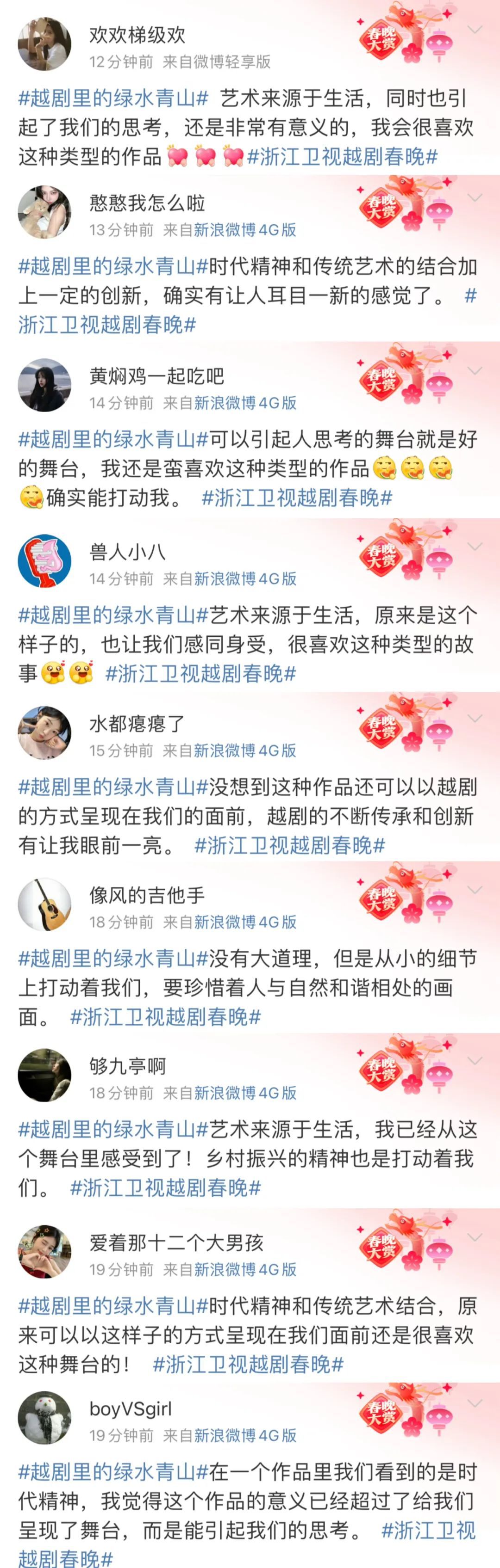 由浙江小百花越剧院院长、“梅花奖”获得者、国家一级演员王滨梅表演的原创越剧《绿水青山》,拨动观众的心弦:“越剧《绿水青山》将普通人追求绿水青山过程中所展现出的真情、责任与担当展现出来,立意深刻,引人深思。”