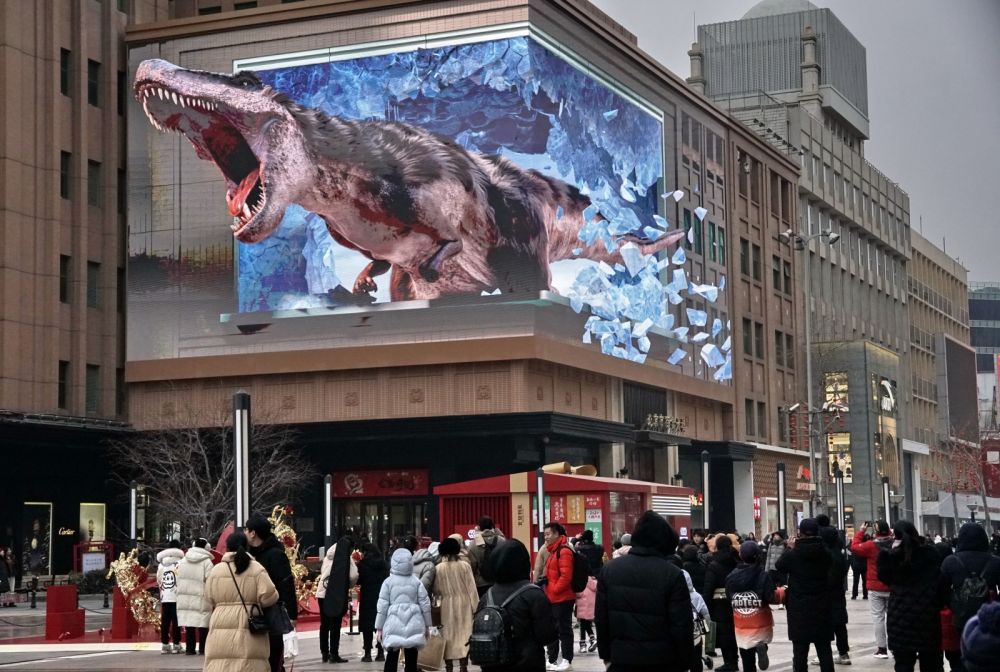 市民在北京王府井商业街观看裸眼3D大屏幕的动画(2024年2月2日摄)。新华社记者 李欣 摄