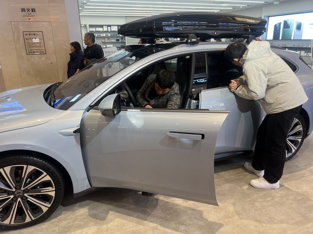 在安徽合肥万象城购物中心,顾客体验一款新能源汽车(2024年2月11日摄)。新华社发(杨元元 摄)