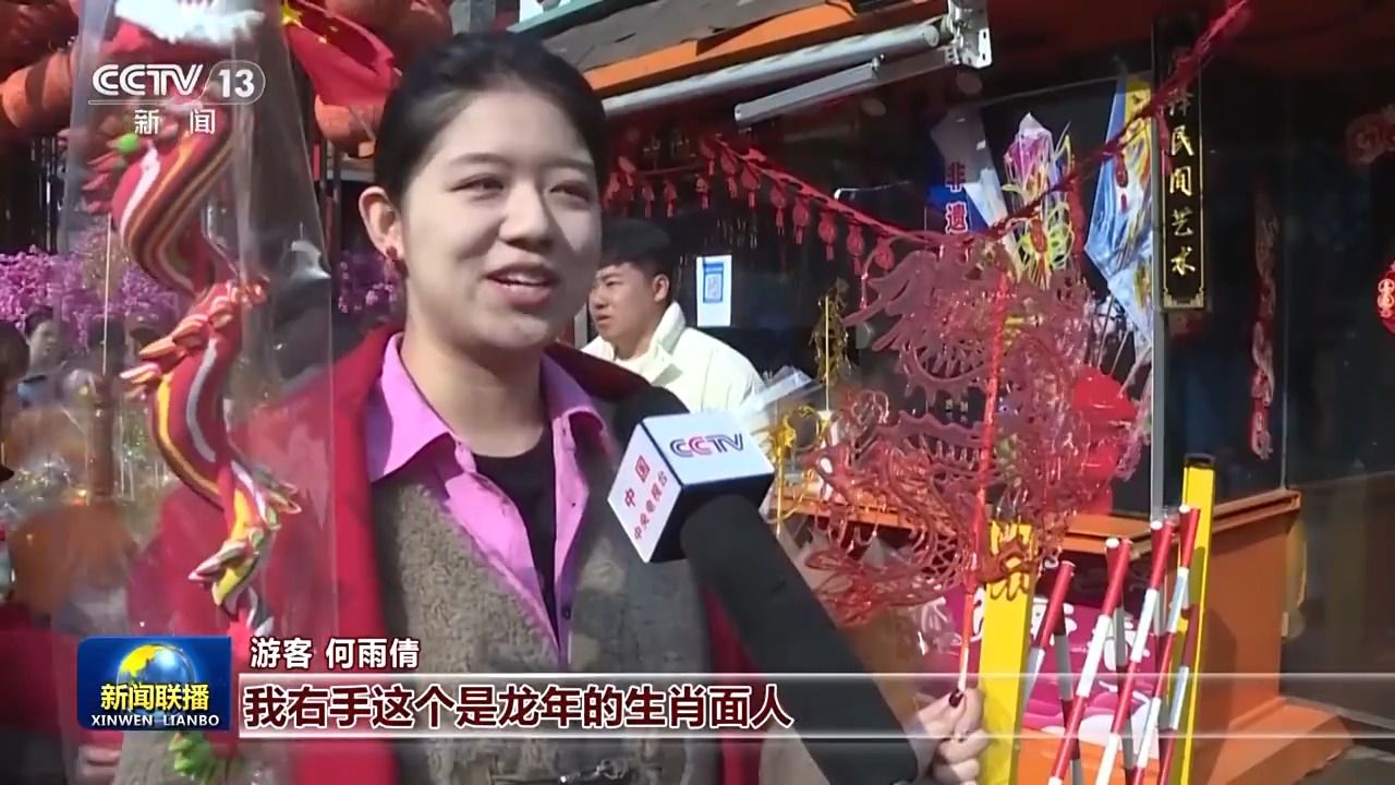 游客 何雨倩:逛庙会,过大年,今天最大的惊喜就是看到了这么多的非遗项目,我右手这个是龙年的生肖面人,左手这个是龙年的糖画,特别适合打卡,真是太有年味了。