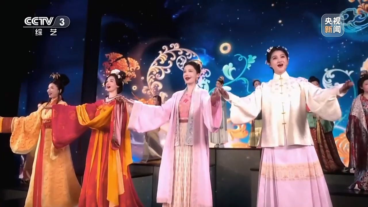 四位演唱者分别身着汉代庄重大气的深衣、唐代富贵华丽的襦裙、宋代简洁柔美的背子和明代端庄典雅的袄裙,并以每套服饰的衣、裙、领边、袖口上不同时期的典型纹样,演绎着中国历史上的流行经典。