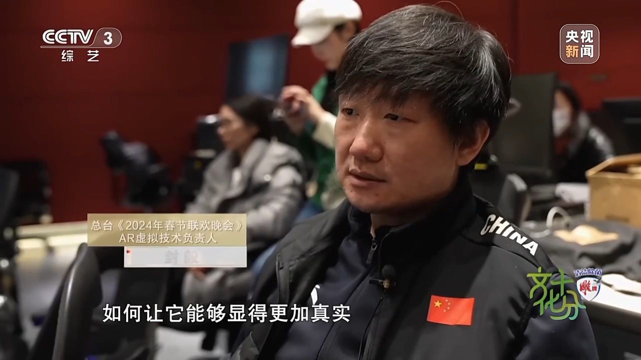 总台《2024年春节联欢晚会》AR虚拟技术负责人 封毅:如何让它能够显得更加真实,而且它怎么样才能在真实的同时,也能跟咱们现场真正的空间环境,包括舞美,进行很好融合,所以我们在技术美术的手段上,进行了一些攻克。