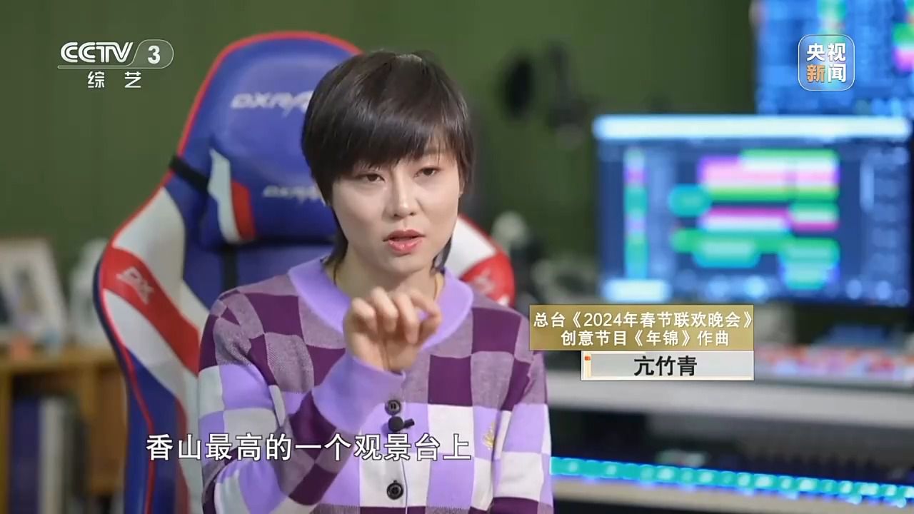 总台《2024年春节联欢晚会》创意节目《年锦》作曲 亢竹青:当我到一个观景台,香山最高的观景台,去俯瞰北京的时候,那个大气的东西一下子就扑到脸上,会觉得,中国很伟大,地大物博。有一种非常厚重的感觉,真的就像一个盘龙一样,很深厚地卧在那里,真的是感触非常深。回来大概两天吧,《年锦》就写完了。
