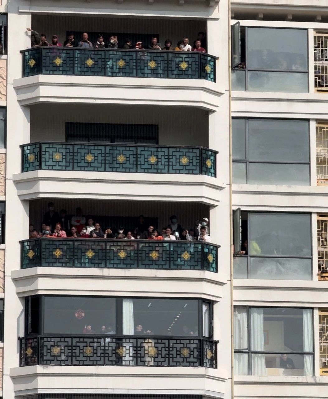 两边的阳台上也站满了当地居民
