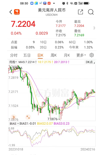 数据显示,目前美元对离岸人民币已回到7.22左右,今年以来截至发稿时升值幅度达到1.32%。尤其是2月13日美国超预期的1月份CPI数据公布后,美联储降息预期再度推迟,当天美元对离岸人民币反弹了160多点,最高达到7.2333,离去年的高点7.3682仅相差1.9%(1300多点)。