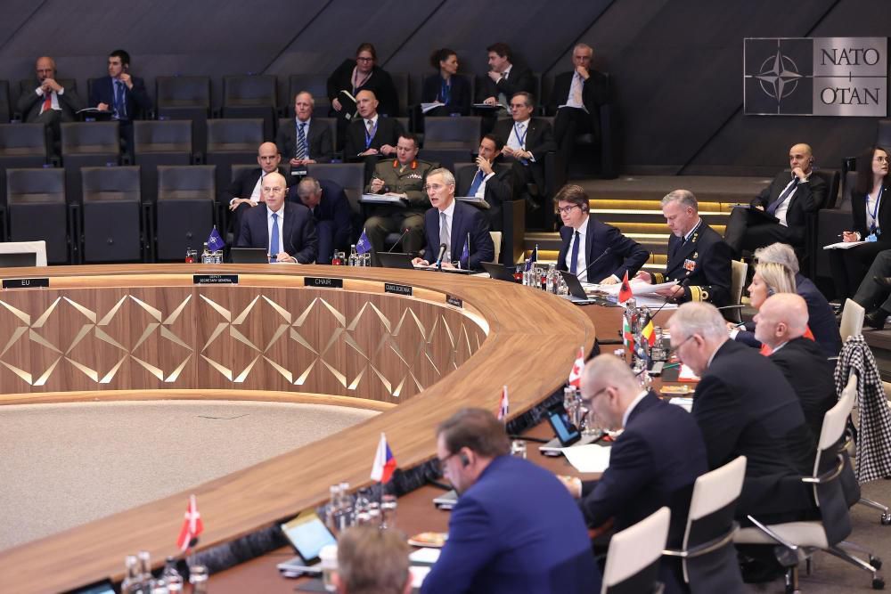 这是2月15日在比利时布鲁塞尔拍摄的北约防长会现场。为期一天的北约成员国国防部长会议15日在比利时首都布鲁塞尔结束。会议就加强北约的威慑和防御以及对乌克兰的支持等问题展开讨论。新华社记者赵丁喆摄