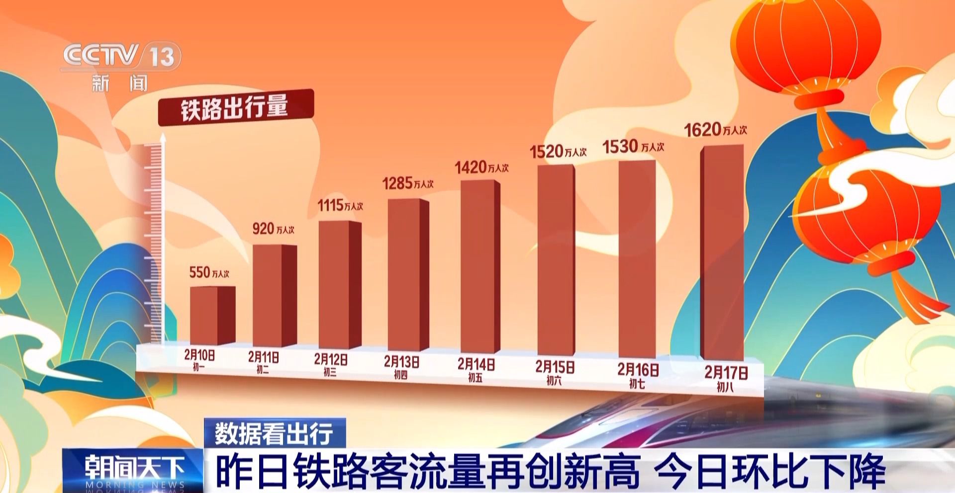 昨天坐火车出行的客流量达到1620万人次,这是春运以来铁路出行首次单日超过1600万人次,再次刷新纪录。