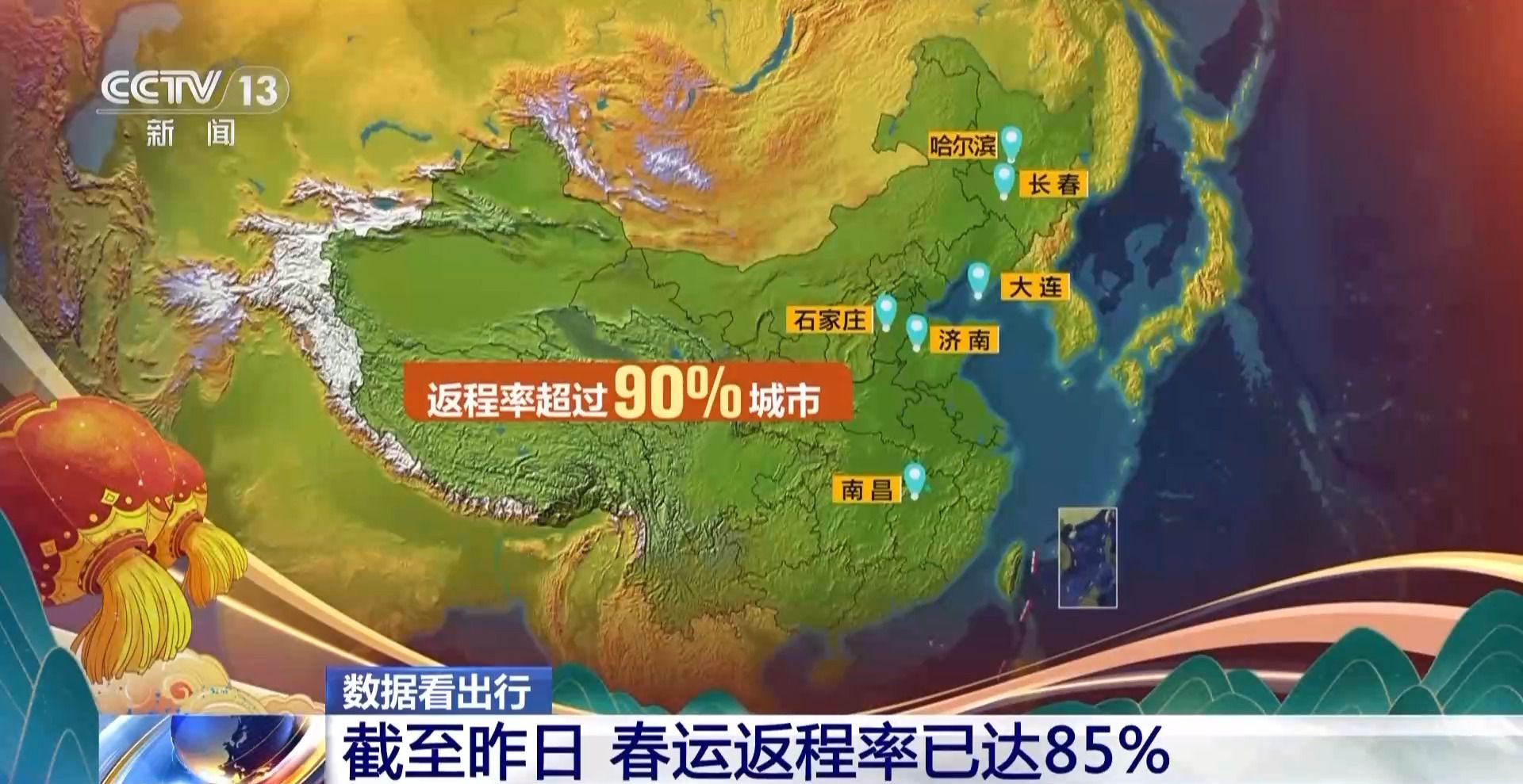 36个城市(包括直辖市、省会城市和计划单列市)返程情况的大数据分析显示,截至大年初八,春运以来离开这些城市的人,已经有85%已经返程。其中,哈尔滨、长春、石家庄、大连、南昌、济南等城市的返程率都超过90%。深圳、长沙、广州、上海等东南部城市的返程人流增速较快,各地返程复工的节奏正在加速。