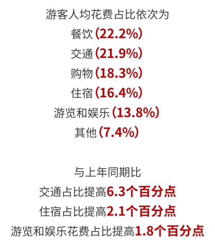 从消费来看,游客人均花费占比依次为餐饮(22.2%)、交通(21.9%)、购物(18.3%)、住宿(16.4%)、游览和娱乐(13.8%)。与上年同期比,交通、住宿、游览和娱乐花费占比分别提高6.3、2.1和1.8个百分点。