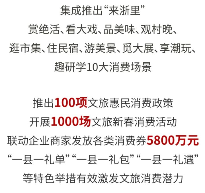 省级层面出台《关于进一步促进文化和旅游消费的若干措施》,统筹组织“来浙里·欢欢喜喜过大年”2024全省文化和旅游新春消费季活动。