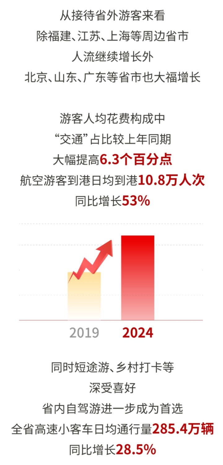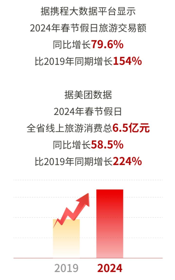 今年是疫情防控平稳转段后的第一个春节,前期“文旅营销”兑现叠加假日效应,旅游市场迎来强劲复苏。全省日均接待游客量创历史同期新高,旅游收快速增长,相比疫情前的2019年,假日旅游消费增幅首次超过旅游人次增幅。