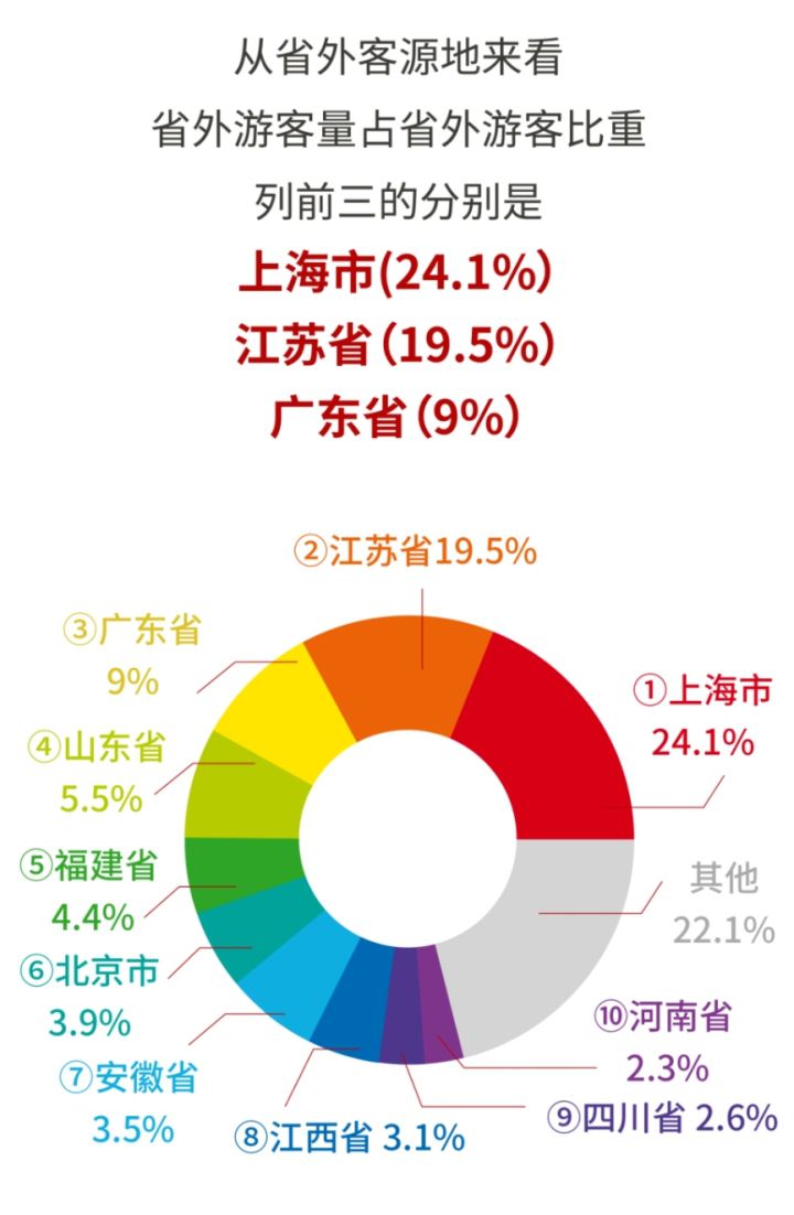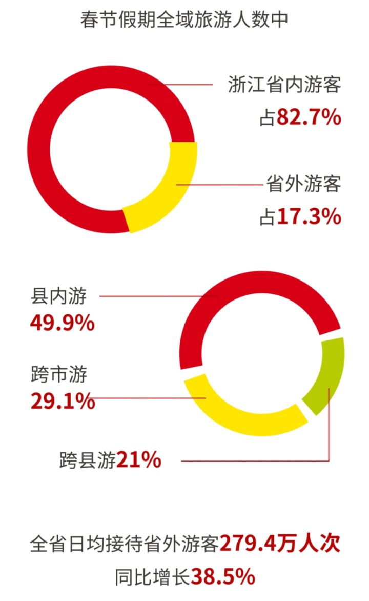 在客源结构方面。春节假期全域旅游人数中,浙江省内游客占82.7%,省内游客构成中,县内游、跨县游和跨市游分别占49.9%、21%和29.1%。全省日均接待省外游客279.4万人次,同比增长38.5%。从省外客源地来看,省外游客量占省外游客比重列前三的分别是:上海市(24.1%)、江苏省(19.5%)、广东省(9%)。
