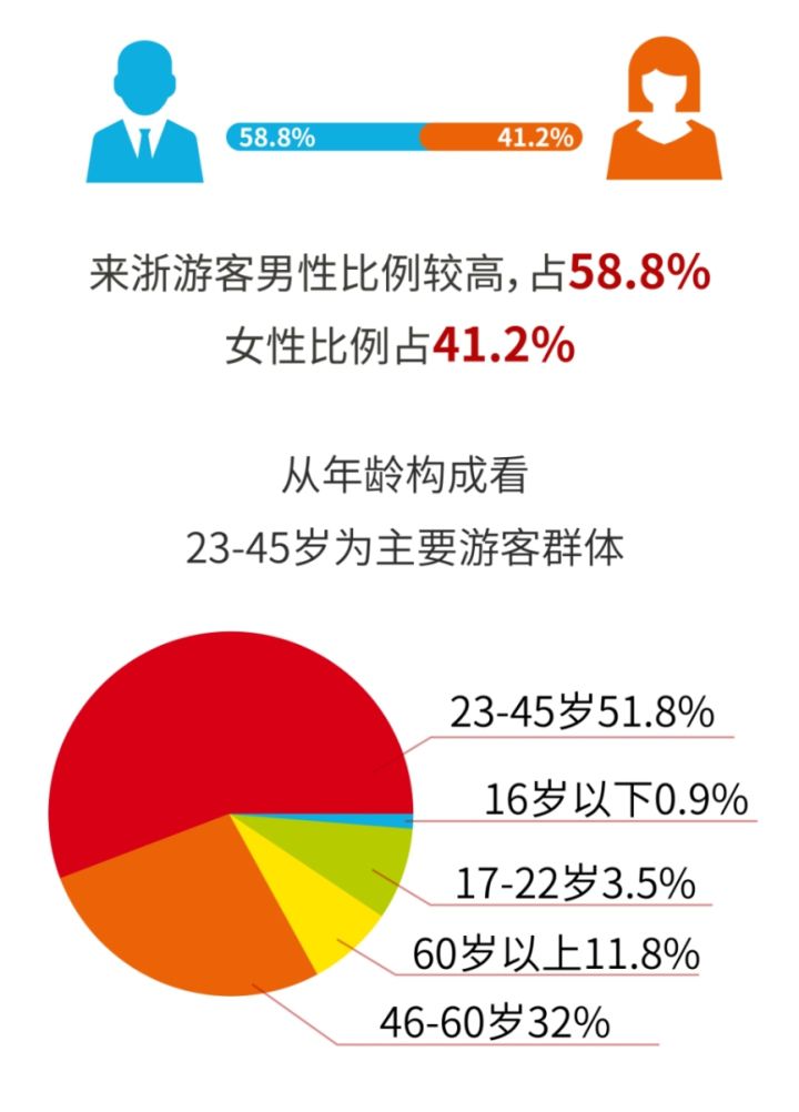 按性别结构来说,来浙游客男性比例较高,占58.8%;女性占41.2%。从年龄构成看,23-45岁为主要游客群体,占51.8%;其次为46-60 岁,占32%;60岁以上占11.8%,17-22岁占3.5%,16岁以下占0.9%。