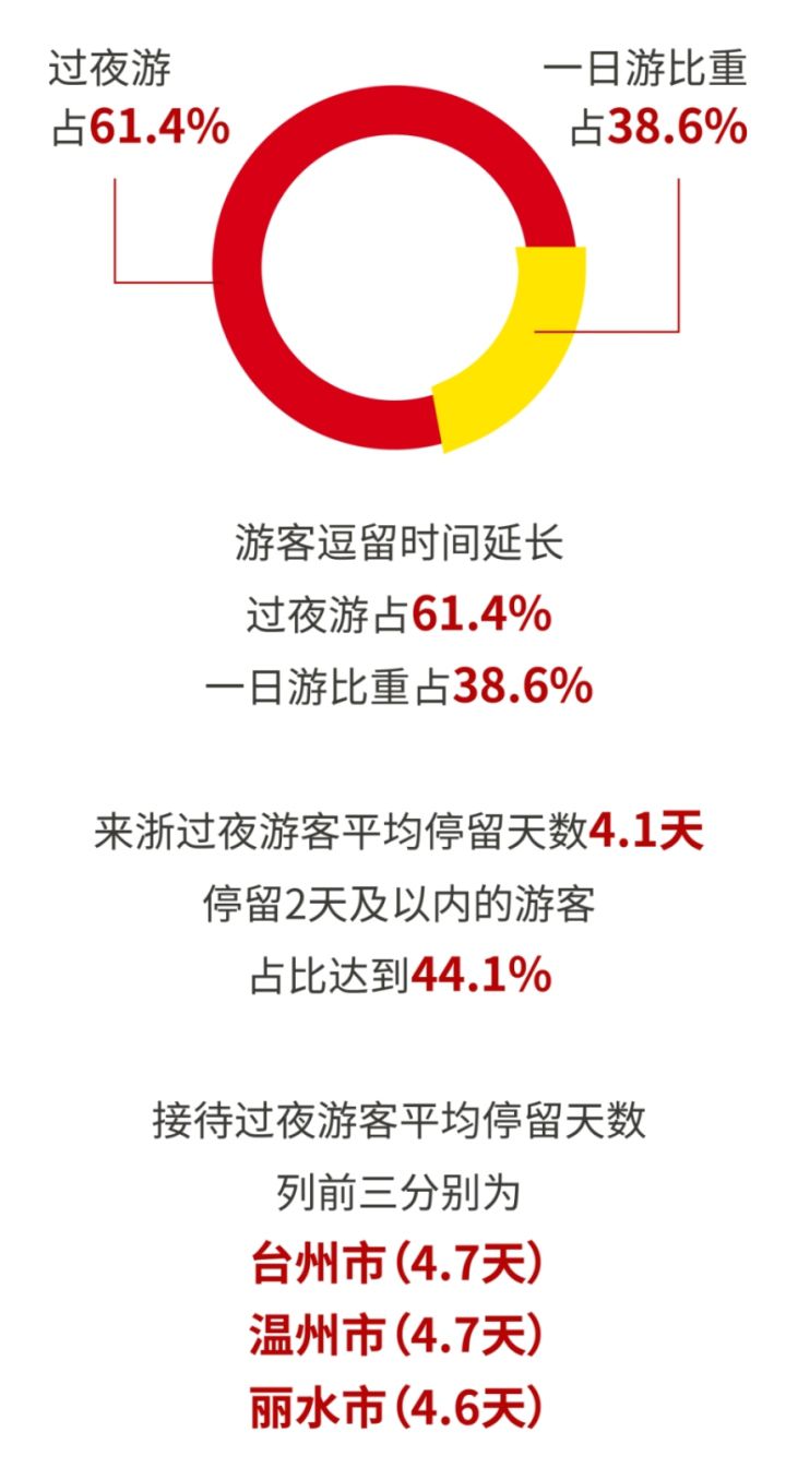 旅游时长方面。游客逗留时间延长,过夜游占61.4%;一日游比重占38.6%。来浙过夜游客平均停留天数4.1天,其中停留2天及以内的游客占比达到44.1%。从各市看,接待过夜游客平均停留天数列前三分别为台州市(4.7天)、温州市(4.7天)、丽水市(4.6天)。