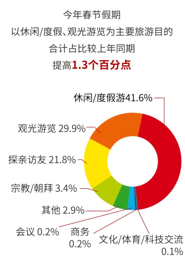 今年春节假期以休闲/度假、观光游览为主要旅游目的,合计占比较上年同期提高1.3个百分点,其中休闲/度假游占41.6%,观光游览占29.9%,探亲访友占21.8%。
