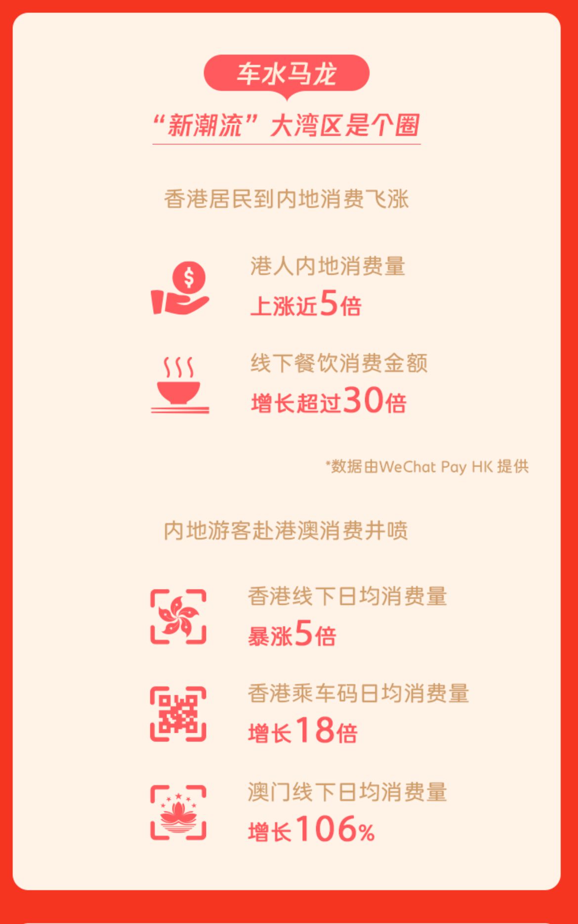 根据微信最新报告显示,越来越多的港澳居民北上探亲、扫货、出游。春节期间,香港居民线上和线下内地消费交易笔数、金额双双大涨,其中交易笔数与2023年春节同比增长近5倍、金额超过3倍。粤港澳大湾区的“一小时生活圈”变得越发便利。