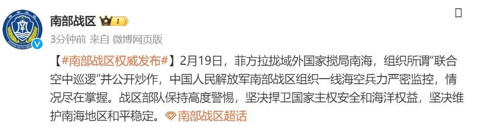 2月19日,菲方拉拢域外国家搅局南海,组织所谓“联合空中巡逻”并公开炒作,中国人民解放军南部战区组织一线海空兵力严密监控,情况尽在掌握。战区部队保持高度警惕,坚决捍卫国家主权安全和海洋权益,坚决维护南海地区和平稳定。