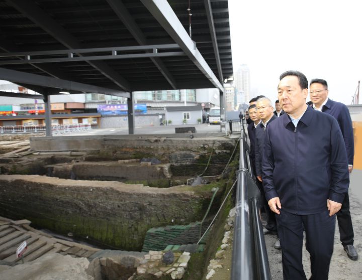 朔门古港遗址是迄今国内外海上丝绸之路港口遗址最为重要的考古发现。遗址内发现的宋元及明清两个时期水、陆城门和码头、沉船、官用栈道、干栏式建筑、瓷片、漆木器等文物标本,重现了温州千年商港的繁华景象。王浩驻足停留,详细了解古港历史和人文遗迹,细细询问文物保护工作推进情况。他强调,习近平总书记高度重视历史文化保护,多次就做好文化遗产保护、传承弘扬中华传统文化作出重要批示指示。要坚持“保护第一、加强管理、挖掘价值、有效利用、让文物活起来”,促进文物和文化遗产整体保护、活态传承,更好地赓续历史文脉、坚定文化自信。