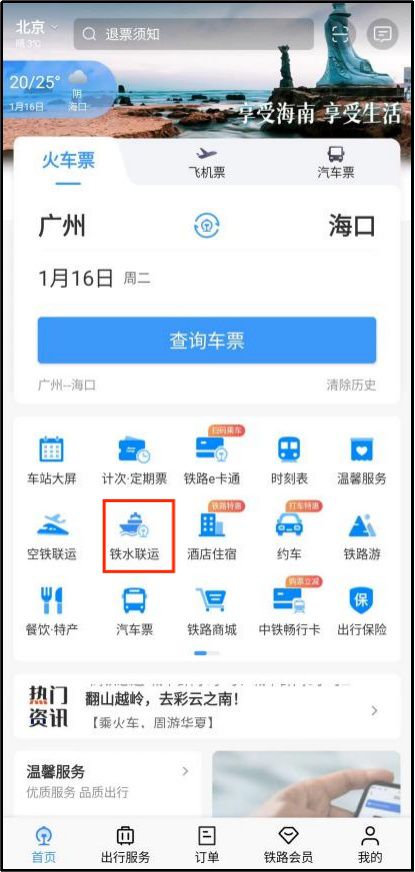 点击12306App首页的“铁水联运”小图标或通过火车余票查询页“铁水联运”推荐专栏进入。