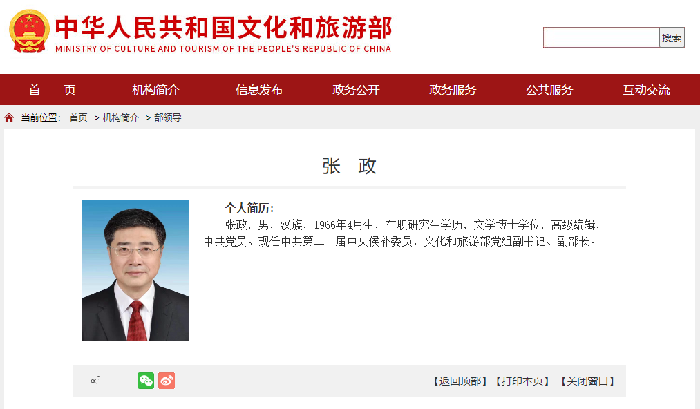 据文旅部官网部领导栏目更新显示,张政已任文旅部党组副书记、副部长。
