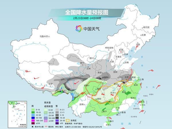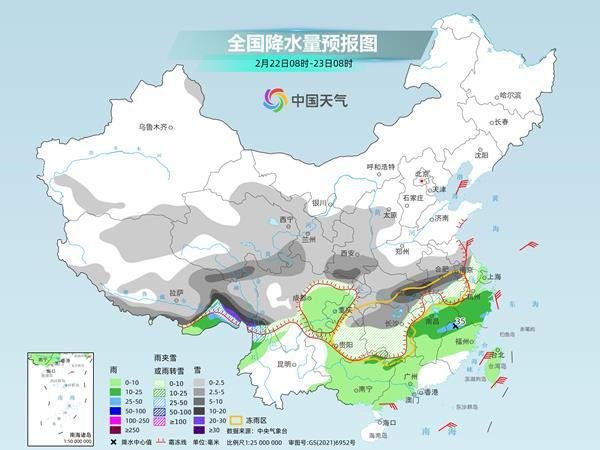 今明天(2月22日至23日),我国雨雪有所减弱,雨雪分界线继续南压。后天,北方大部降雪基本停歇,而南方阴雨雪天气还将持续到本月底,需注意防范雨雪冰冻对春运出行的不利影响。雨雪压制下,南方大部气温偏低的状态将延续至27日前后,北方大部今起缓慢升温。