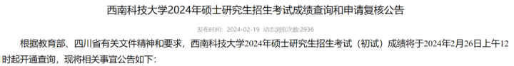 西南科技大学考研初试成绩,查询时间为2月26日12点起。