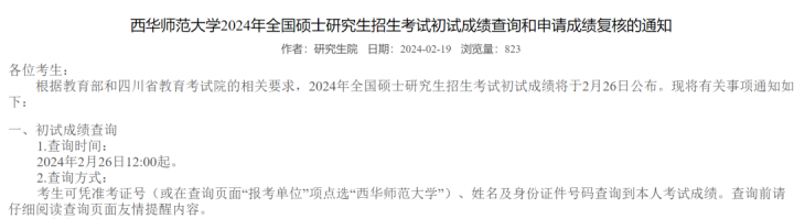 西华师范大学考研初试成绩,查询时间为2月26日12点起。
