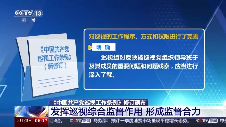 日前,中共中央印发了新修订的《中国共产党巡视工作条例》。条例的修订颁布,有利于进一步推动巡视工作深化发展,完善党的自我革命制度规范体系。