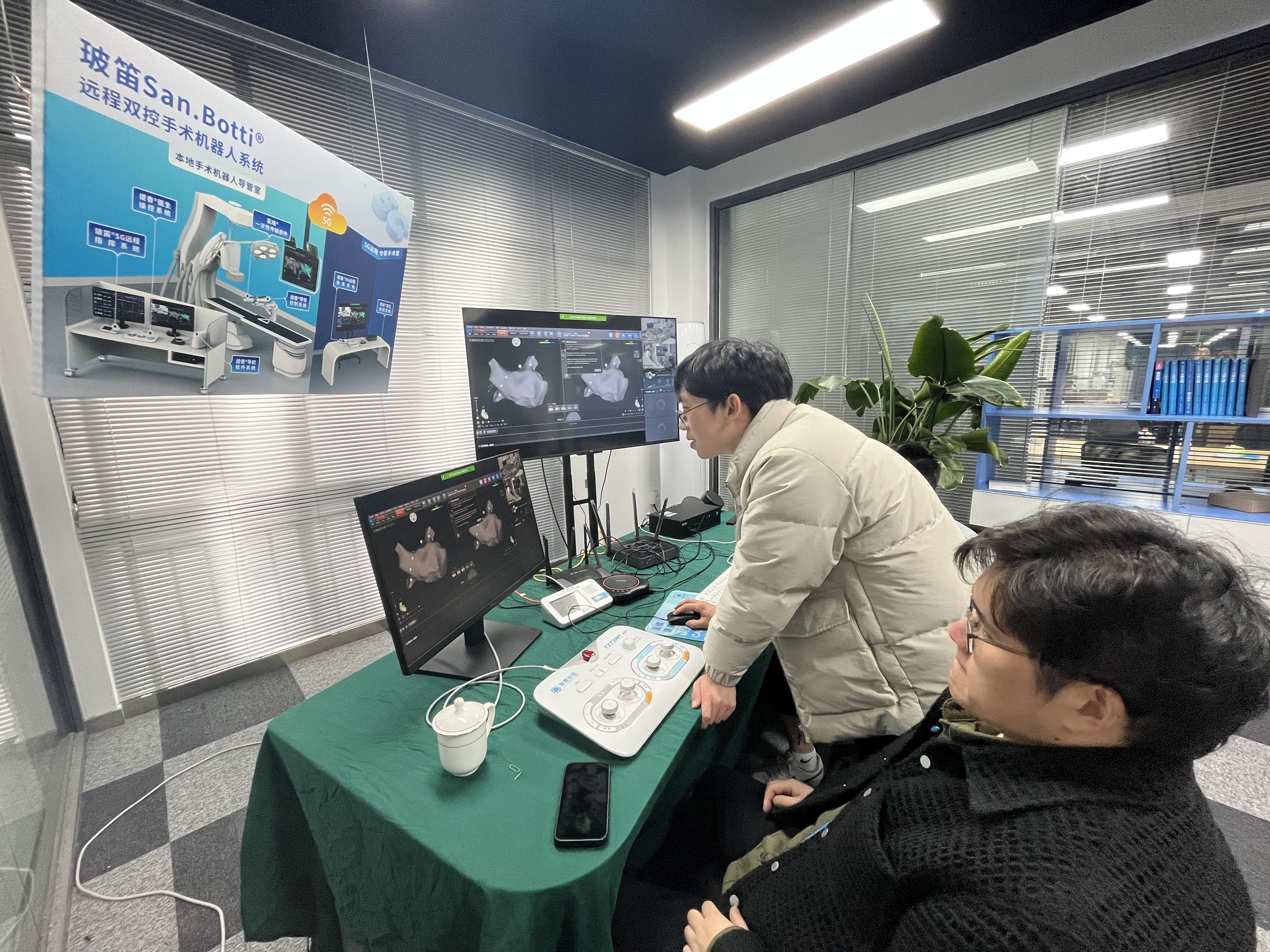 这几天,绍兴梅奥心磁医疗科技有限公司内,两名科研人员正在紧张调试公司自主研发的“玻笛”远程双控手术机器人系统。