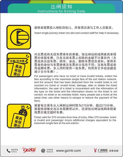 根据广州地铁的现行票务规则,广州没有所谓的“超时服务费”,不过根据广州地铁官网公布的进闸须知,“乘客每次乘车从入闸到出闸时限为270分钟,超过270分钟,乘客除须缴交当次车程费用以外,还须按出闸站线网单程最高票价缴交超时车费。”