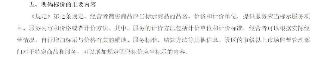 按照《明码标价和禁止价格欺诈规定》,经营者销售商品时应当标示商品的品名、价格和计价单位,提供服务时应当标示服务项目、服务内容和价格或者计价方法。