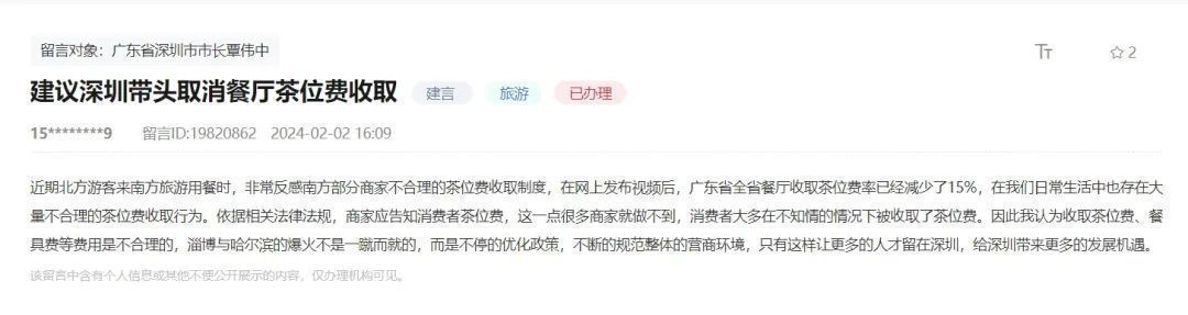该网友认为收取茶位费、餐具费等费用是不合理的,希望有关部门能不停优化政策,不断规范整体的营商环境,给深圳带来更多的发展机遇。