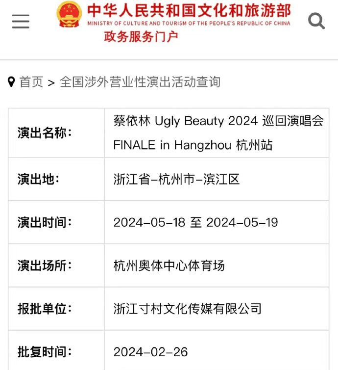 此前蔡依林官宣过今年的演唱会将有杭州站,而最新的审批信息显示,蔡依林的杭州演唱会将不止步于一场,而是5月18日、19日连开两场。