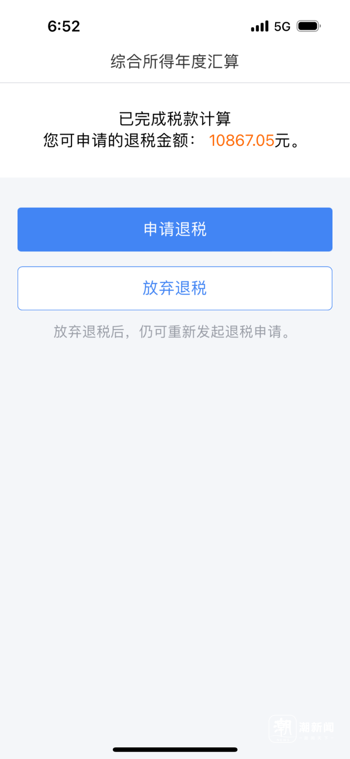 今天(3月1日)起,2023年度个税综合所得汇算开始了。一大早,市民诸葛女士就和记者分享了好消息:成功退税10867.05元。