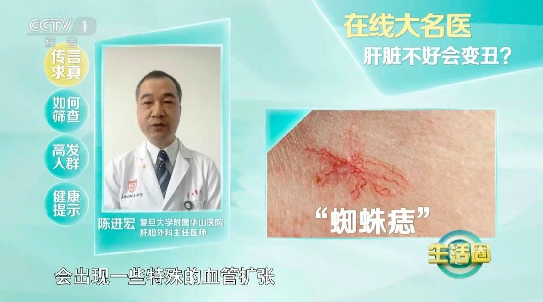 蜘蛛痣是一种细小的血管扩张,看起来像红色或紫色的蜘蛛网状图案,常见于面、颈和上胸部,这可能是肝脏疾病导致雌激素水平升高的结果。