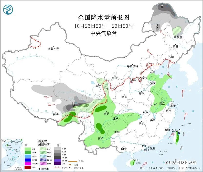 1、25日20时至26日20时,内蒙古东北部、黑龙江中西部、西藏北部、青海南部、甘肃南部、川西高原北部等地部分地区有小到中雪或雨夹雪,其中,西藏东北部、青海东南部等地局地有大到暴雪。西藏东南部、山东大部、安徽中部、江苏大部、湖南北部、西南地区大部、台湾岛大部等地部分地区有小到中雨,其中,台湾岛东北部等地局地有大雨。