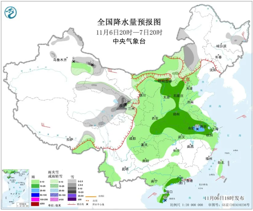 1、11月6日20时至7日20时,新疆北疆北部和东部、青海东部和南部、甘肃河西、内蒙古中西部、河北北部、黑龙江东部等地部分地区有小到中雪或雨夹雪,其中,新疆东部、青海东部等地局地有大到暴雪。内蒙古西部、西北地区东部、华北大部、黄淮大部、江淮、江汉、江南北部和东部、西南地区东部、云南西南部、华南大部、台湾岛等地部分地区有小到中雨,其中,安徽中南部、广东西南部沿海、海南岛东部等地局地有大雨。
