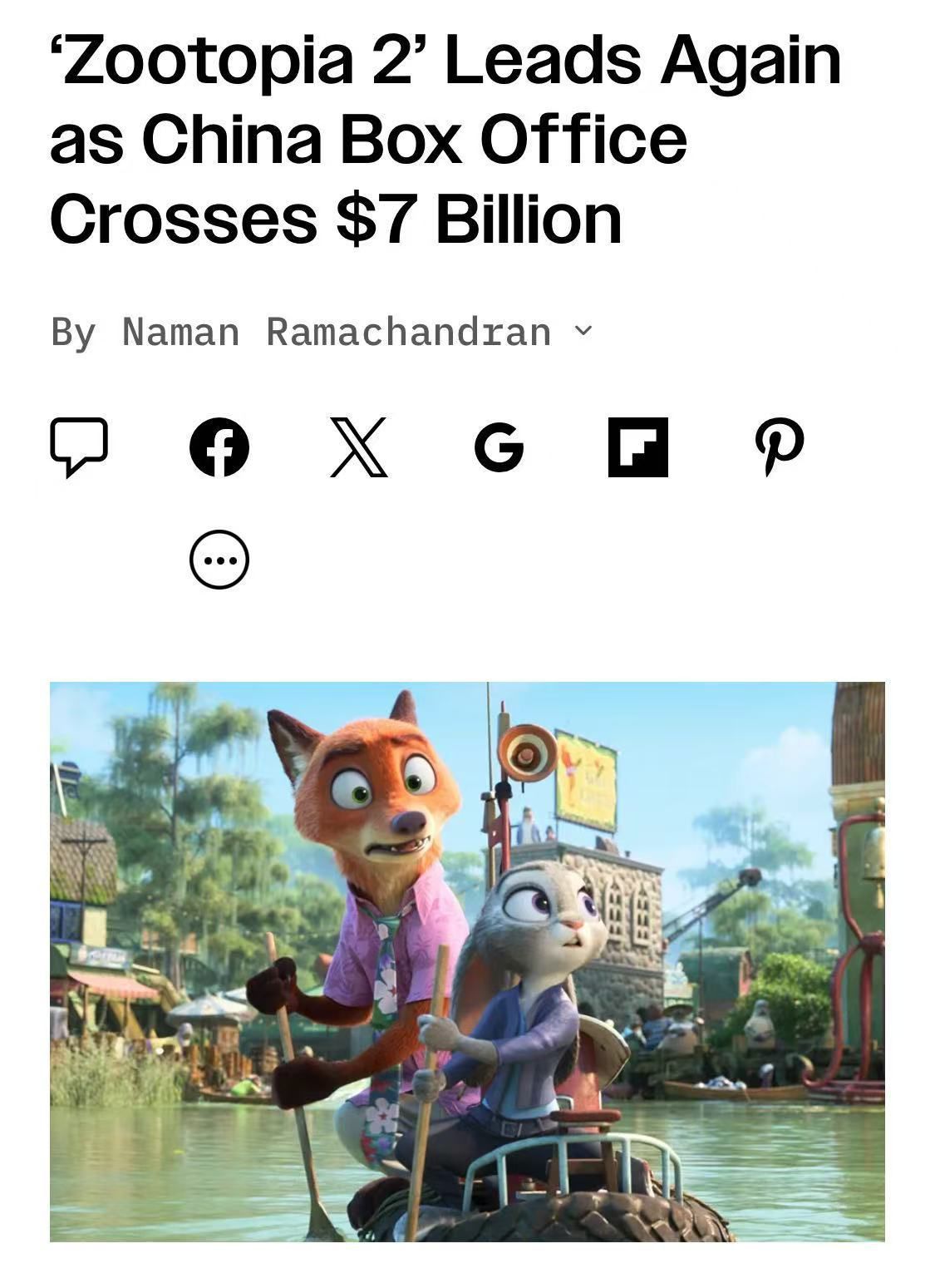 《综艺》则在中国票房周报中把《疯狂动物城2》的表现放进“市场整体盘子”里观察。该刊援引数据称,中国年度票房在年末档期已跨过70亿美元关口,“头部影片带动效应”正在拉动市场热度回升。