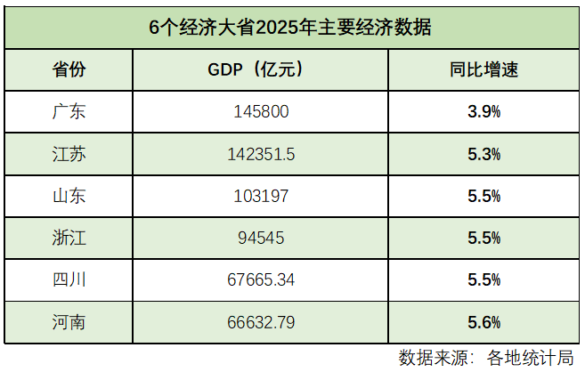 目前,广东、江苏、山东、浙江、四川、河南六个经济大省均已公布了2025年经济“成绩单”。山东成为继广东、江苏之后,全国第三个GDP突破10万亿元的省份;五个省份的GDP增速高于全国水平。
