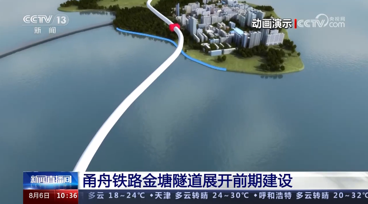 8月6日,央视《新闻直播间》栏目播出报道《甬舟铁路金塘隧道展开前期建设》,关注甬舟铁路全线控制性工程和重难点工程——金塘海底隧道正在进行前期施工。明年5月,盾构机开始向海底掘进,预计2027年海底隧道将贯通。