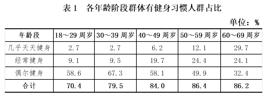 记者了解到,在日常有健身习惯的人群中,几乎天天健身的占7.8%,超半数以上的人偶尔健身。同时,不同年龄段人群在健身参与度方面存在差异。调查发现,40岁及以上人群健身参与度普遍较高,健身人群占比均超过80.0%。其中,60~69周岁人群里几乎天天健身和经常健身者的比例超过五成。而在18~29周岁和30~39周岁人群,这一比例分别仅为11.8%和12.2%。