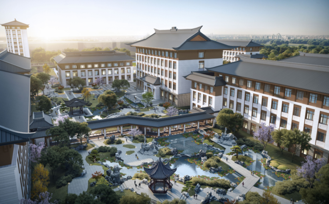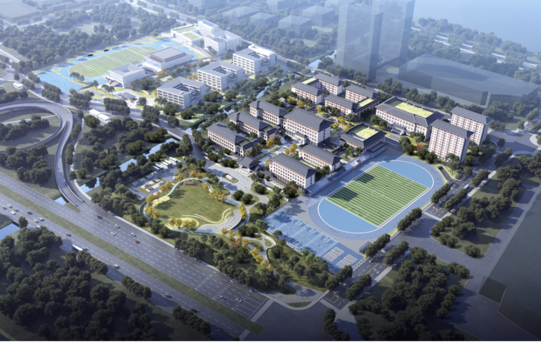 镇海中学甬江校区项目是北仑2023年十大民生实事项目之一,同时也是“六促六优”项目。该项目设计传承传统书院的院落制式,并向现代校园延伸,挖掘镇中印象中门楼、重屋、雅阁、凉亭、校碑、石桥等元素,结合中式建筑中“屋、园、桥、水”等元素,打造“一轴五院一境”格局,着力呈现一个“自由共享,复核多元”的山水书院。